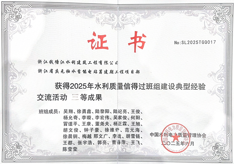 近日,中國水利電力質量管理協(xié)會公布2025年度水利質量信得過班組建設典型經(jīng)驗交流活動評選結果,慶元抽蓄籌建期EPC總承包項目憑借扎實有效的質量管理實踐和突出的建設成果,榮獲“2025年水利質量信得過班組建設典型經(jīng)驗交流活動”三等成果。這一榮譽不僅為“浙錢水建”品牌再添光彩,更標志著公司在工程質量管理領域獲得了行業(yè)權威機構的高度認可。