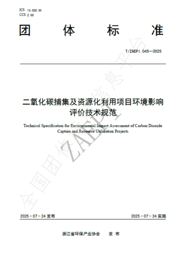 2025年7月24日,由浙江省環(huán)保集團生態(tài)環(huán)保研究院牽頭制定的《二氧化碳捕集及資源化利用項目環(huán)境影響評價技術規(guī)范》(T/ZAEPI 045-2025)團體標準正式發(fā)布并實施。該標準由浙江省環(huán)保產(chǎn)業(yè)協(xié)會歸口管理,聯(lián)合省內多家環(huán)保領域骨干企業(yè)共同起草,填補了工業(yè)領域二氧化碳捕集及資源化利用項目環(huán)評技術規(guī)范的空白。